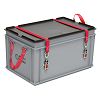 Behälter für Gefahrgut RAKO GGVSEB, PP, Behälter silbergrau, Deckel dunkelgrau, aussen 600x400x338 mm, innen 558x358x308 mm, 60.0l, Verpackungsgruppe I-III, Bruttohöchstmasse 30.0 kg, Schaumstoffeinlage, in Deckel, eingeklebt, Prägung ab Cliché, auf einer Kurzseite, eingemittet, schwarz, Traggurt, auf beiden Kurzseiten, angenietet, Spanngurte mit Klemmschloss, an Behälter aussen, angenietet