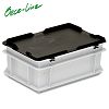 Scharnierdeckel Oeco-Line, PP UIC, schwarz, aussen 300x200x28 mm, mit Schnappverschlüssen, mit 4 Gurtaussparungen, zu RAKO 300x200 mm, EAN-Etikette, Nr. 6035.937